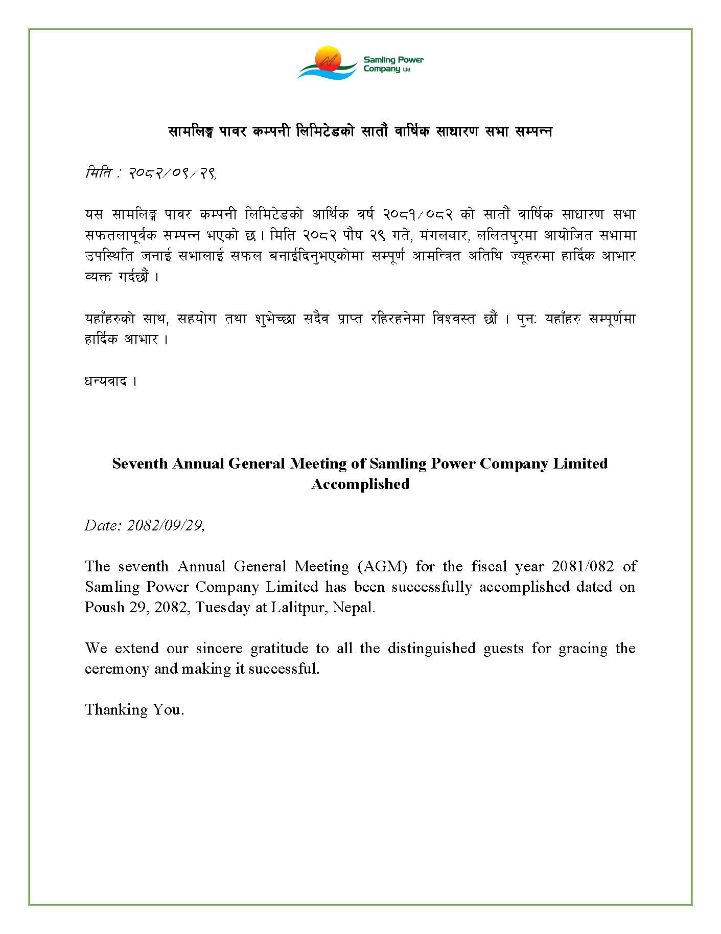 समुदायका सम्पूर्ण बासिन्दाहरुलाई शेयरको सार्वजनिक निष्काशनमा निवेदन पेश गर्न प्रोत्साहन गर्दै सो अवसरको पुर्ण रुपमा उपयोग गरी आयोजनाबाट लाभान्वित हुन अनुरोध गर्दछौ ।